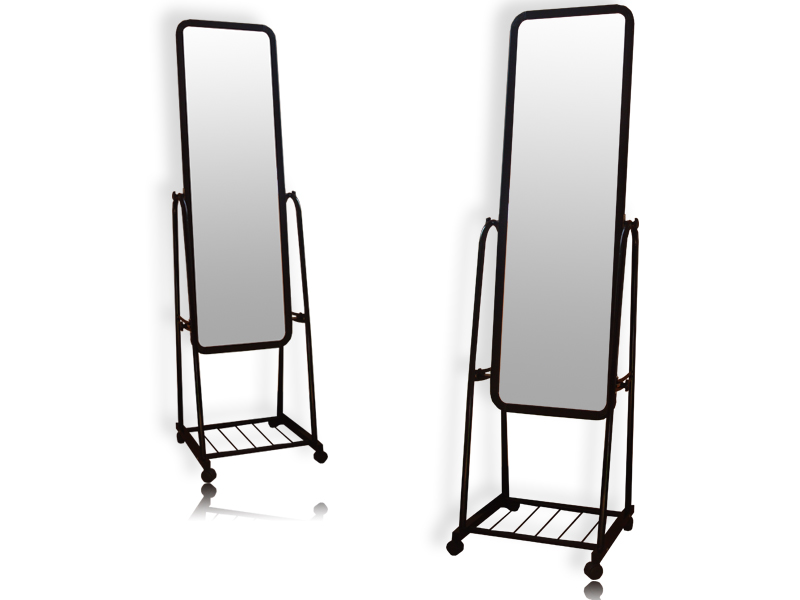 Kółka umożliwiają swobodny transport. Lustro oprawione w metalową ramę.