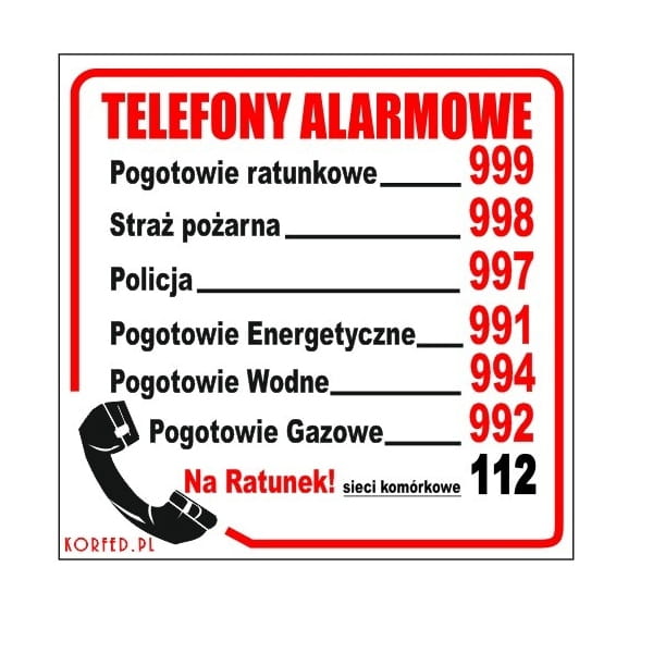 NAKLEJKA INFORMACYJNA - TELEFONY ALARMOWE |BIAŁA| (15x15cm)