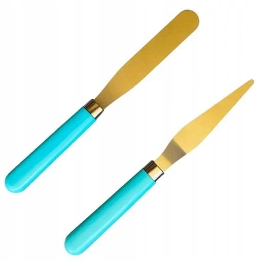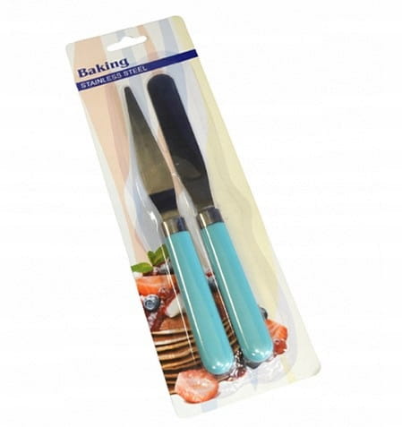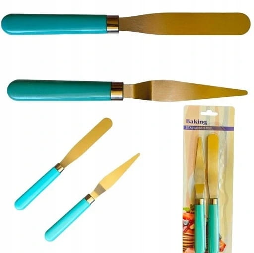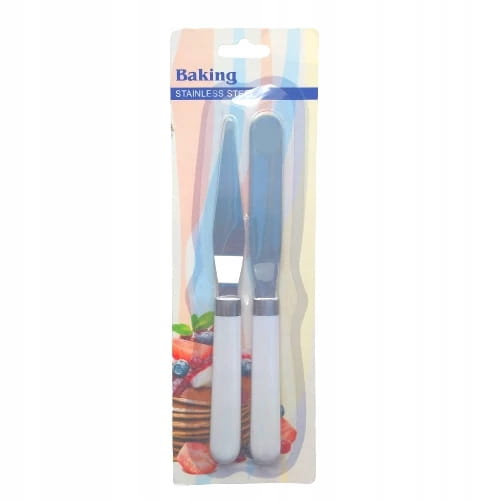 Zestaw szpatułek cukierniczych, które bardzo pomagają w nałożeniu kremu lub innej masy. W skład zestawu wchodzi 2 szpatułki o różnym kształcie. Może również wygładzać polewy czekoladowe. Przeznaczone do małych i średnich powierzchni. Wyprofilowany kształt rączki pozwala pewnie używać szpatułkę. Szpatułki wykonane ze stali nierdzewnej i tworzywa którego struktura w łatwy sposób pomaga w utrzymaniu czystości rączki co jest ważne przy dekoracji tortu.
