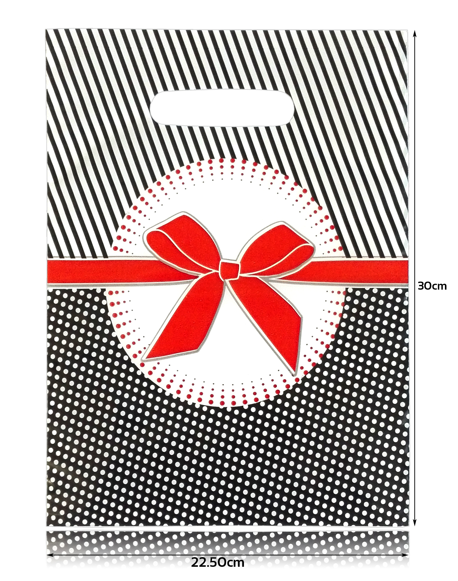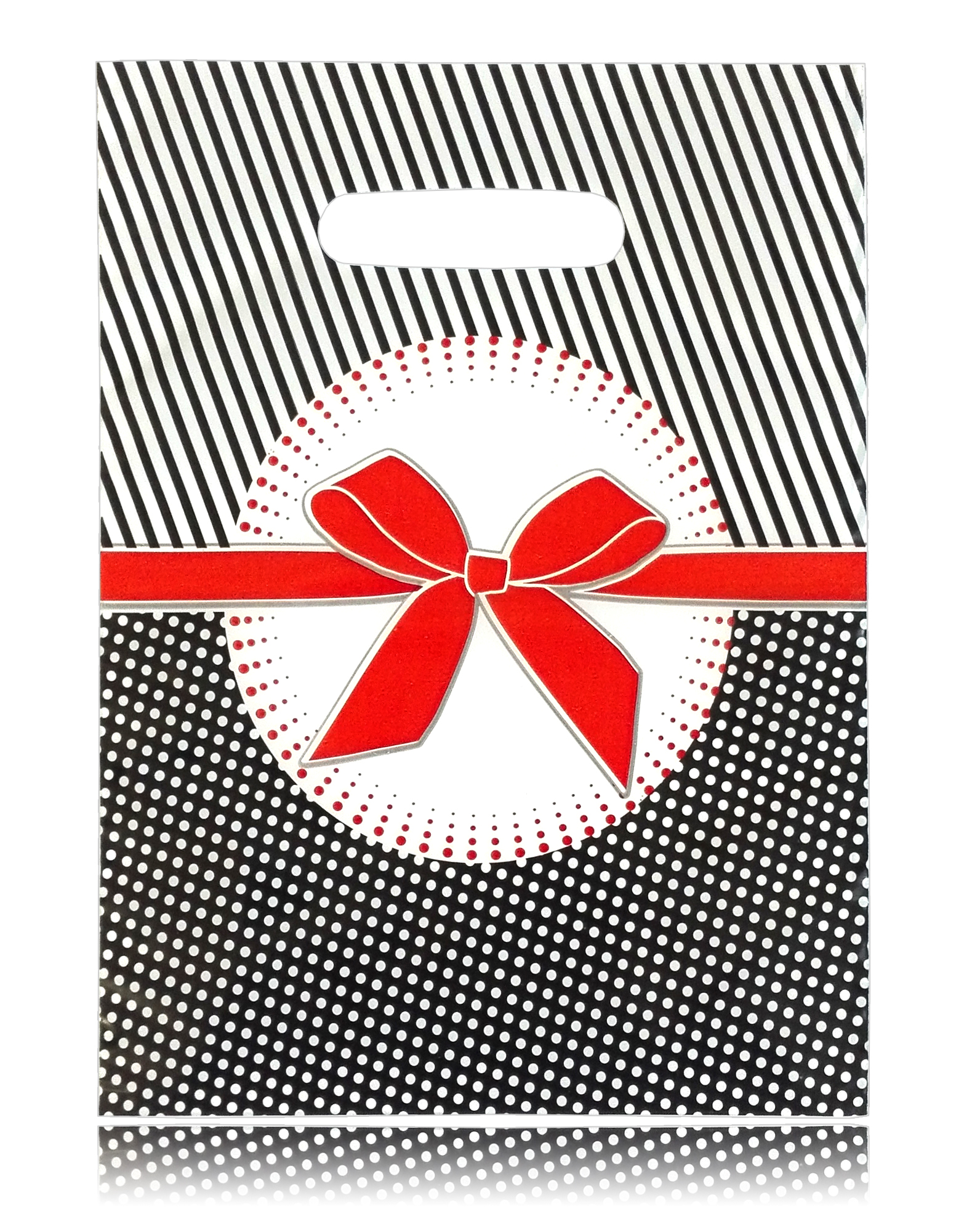 Bardzo atrakcyjne reklamówka z folii LDPE z nadrukiem w pepitkę z czerwoną kokardą, opakowanie zawiera 50 sztuk.