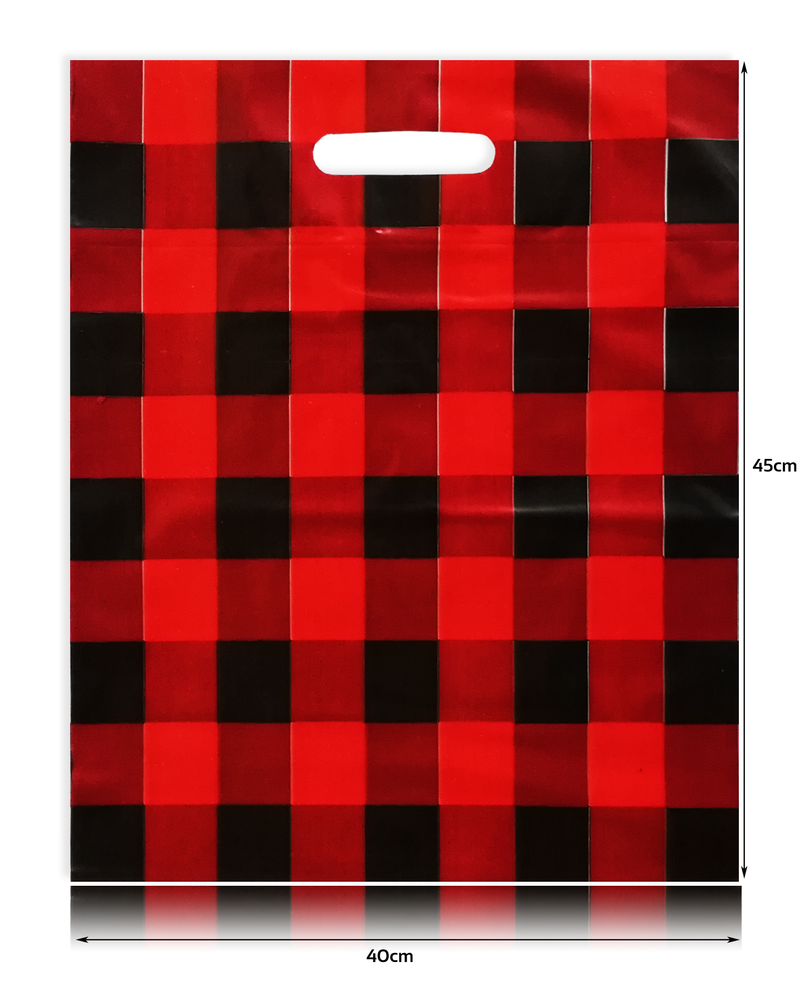 Bardzo atrakcyjne reklamówka z folii LDPE z nadrukiem w kratę szaro-czarną , opakowanie zawiera 50 sztuk.
