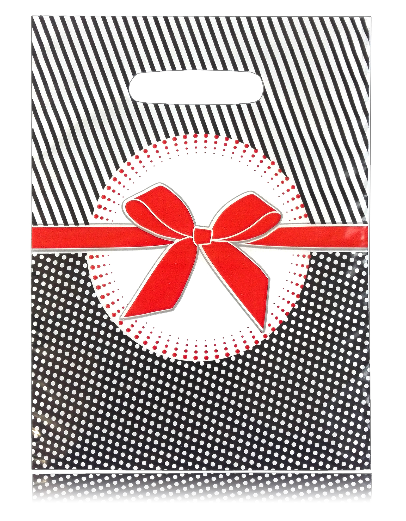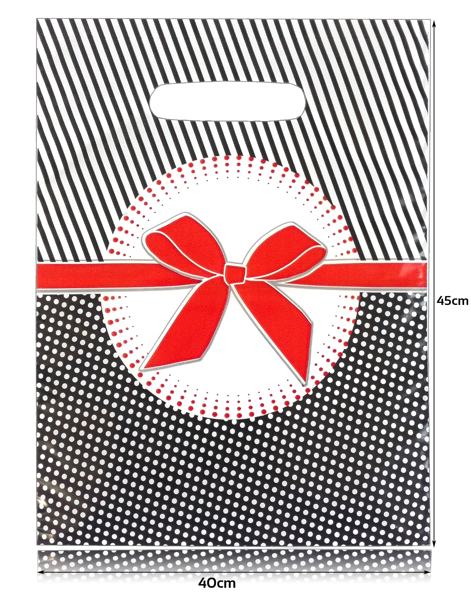 Mocna reklamówka z możliwością zastosowania w dowolnej dziedzinie (np. zieleniak, spożywka, sklep z odzieżą, itp.)Bardzo atrakcyjne reklamówka z folii LDPE z nadrukiem w pepitkę z czerwoną kokardą, opakowanie zawiera 50 sztuk.