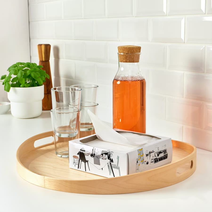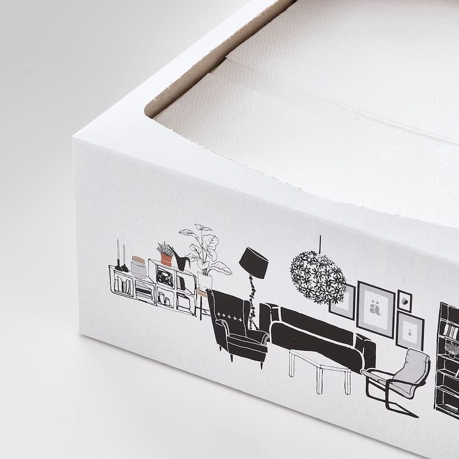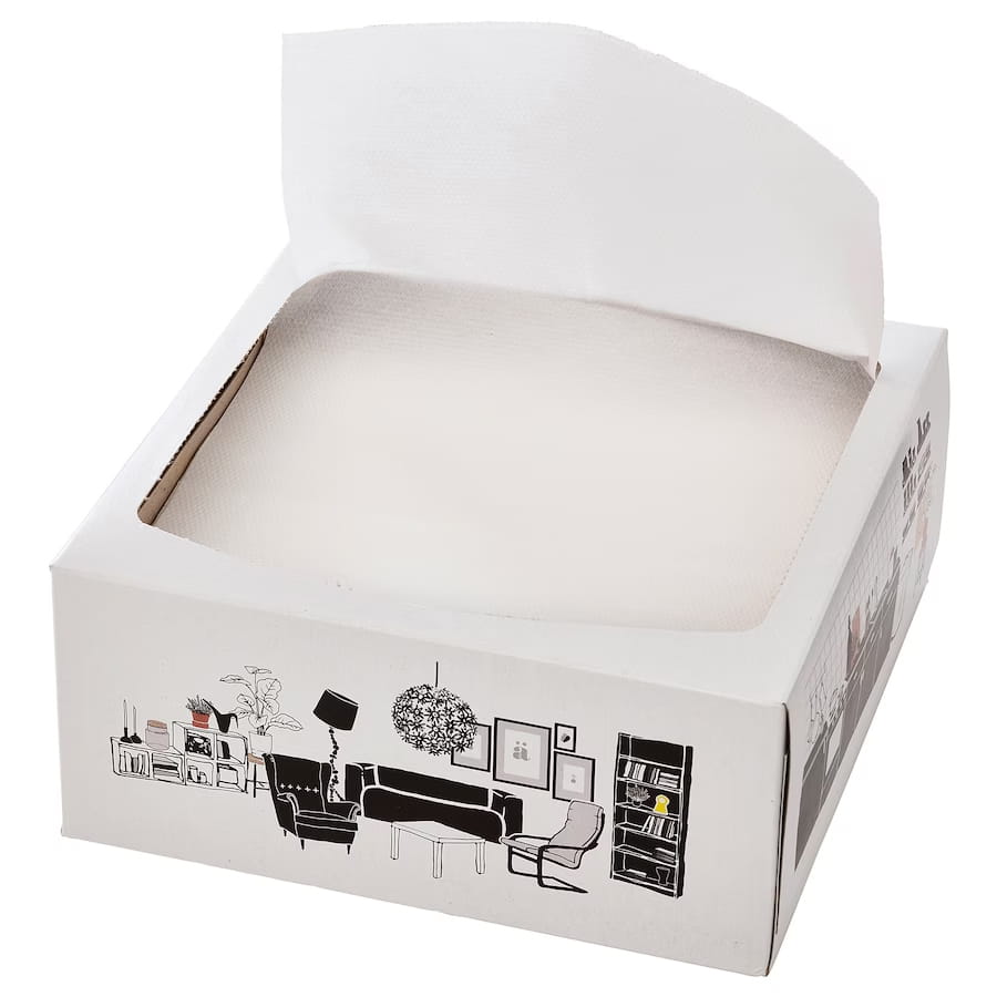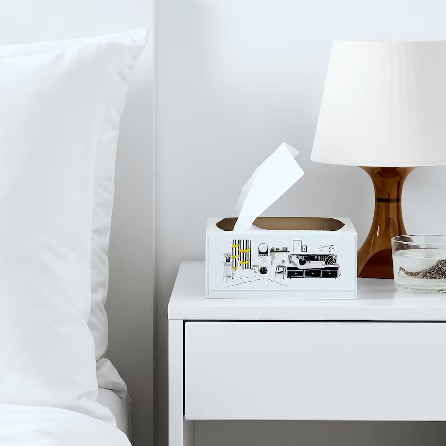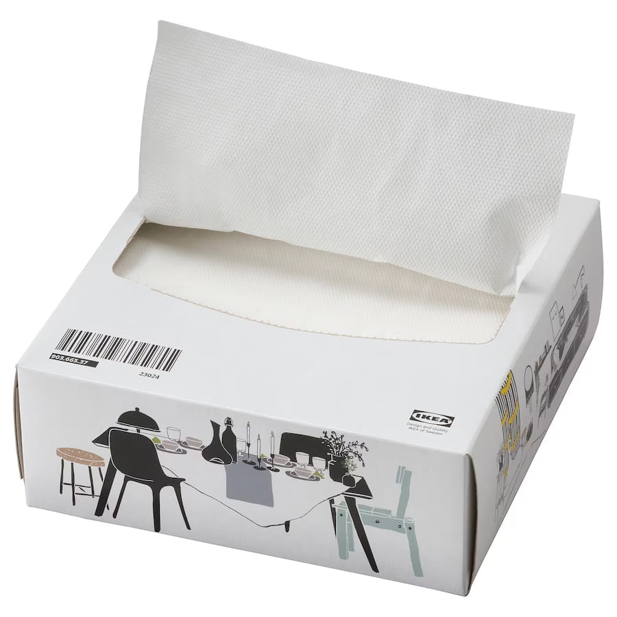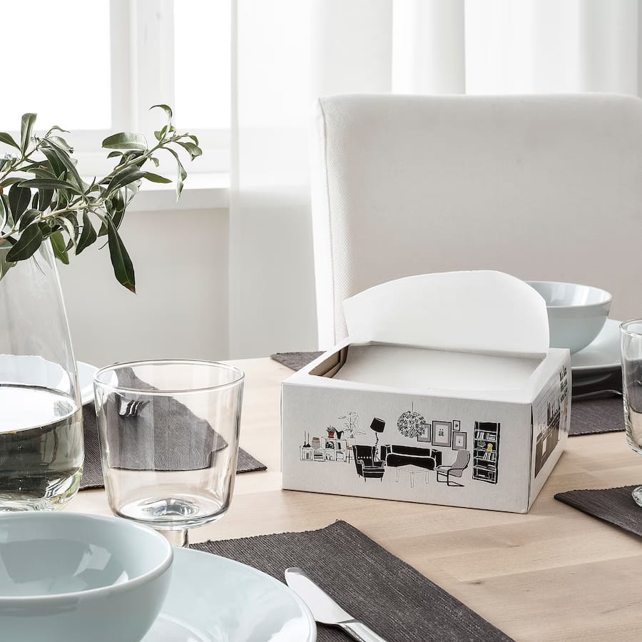 Serwetki w pudełu ozdobionym kultowymi artykułami IKEA. Są praktyczne do stosowania w całym domu lub podczas wycieczek samochodem czy na pikniku.