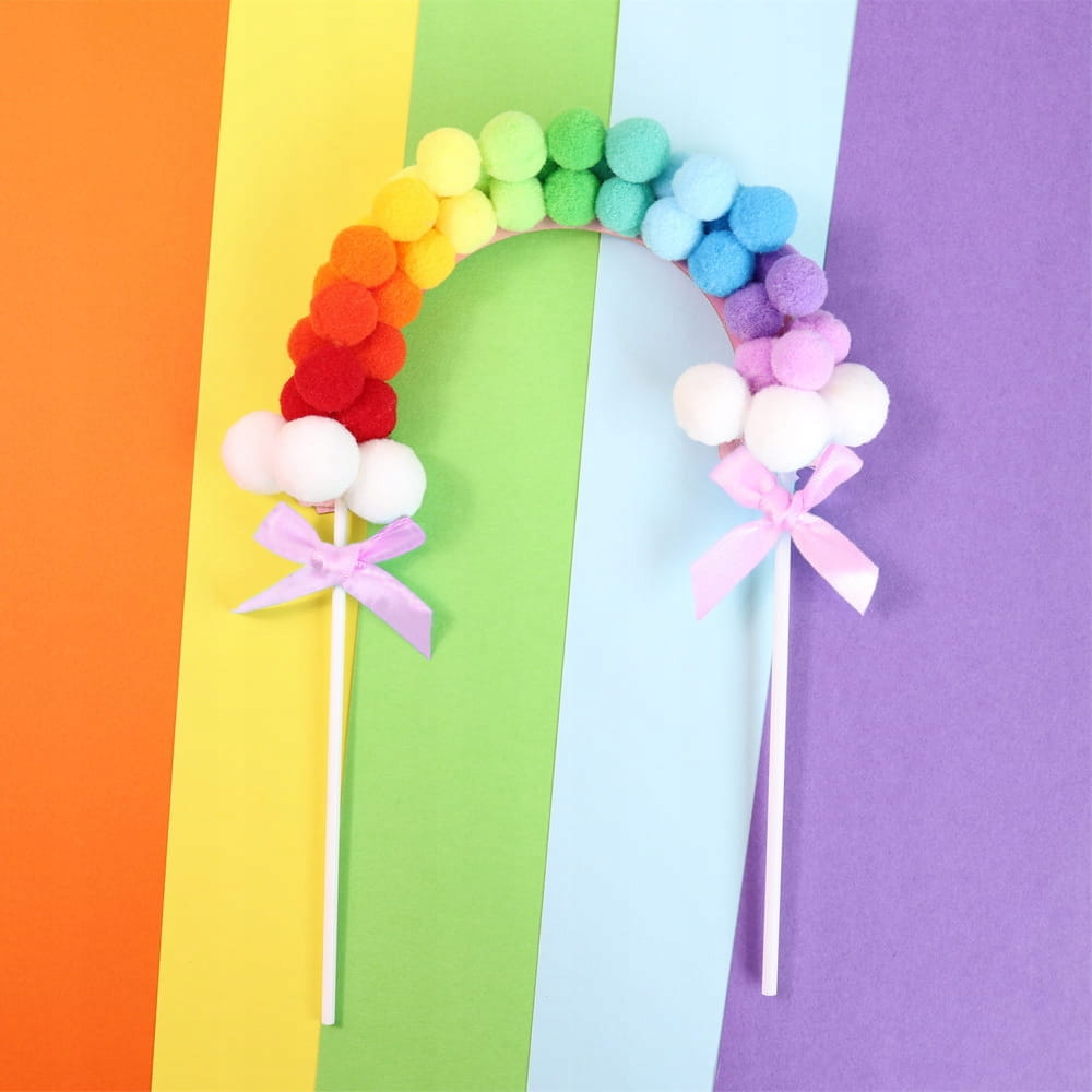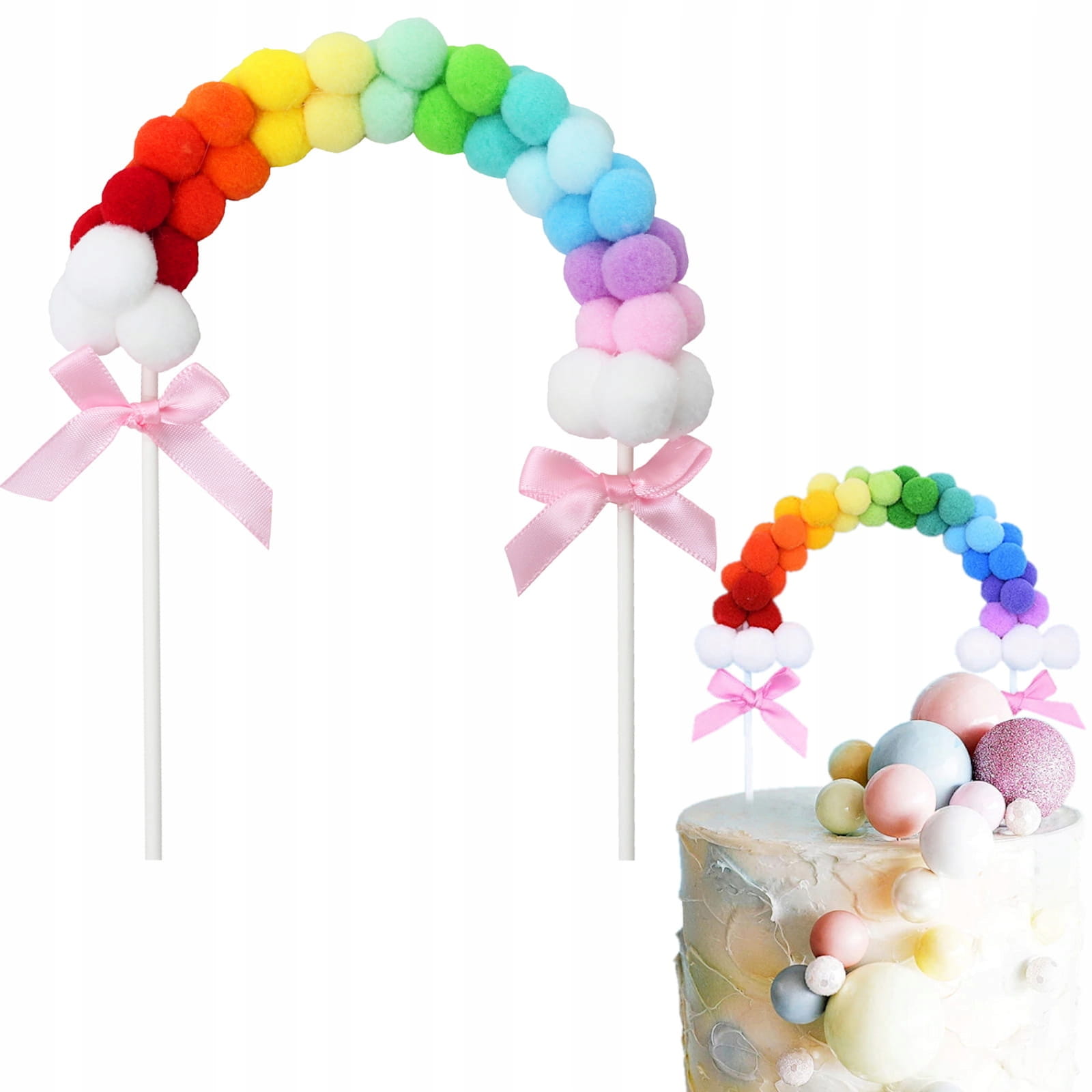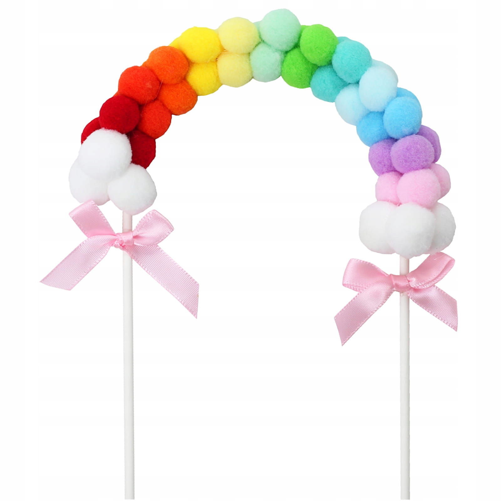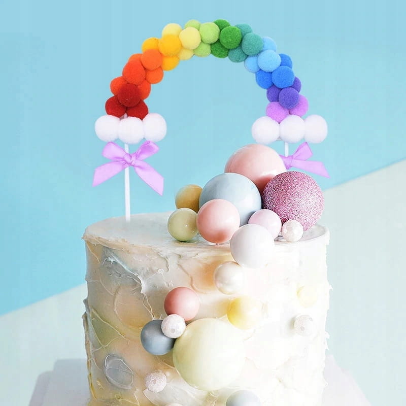 - dekoracja urodzinowa na tort, topper kolorowe pomponiki, tęcza