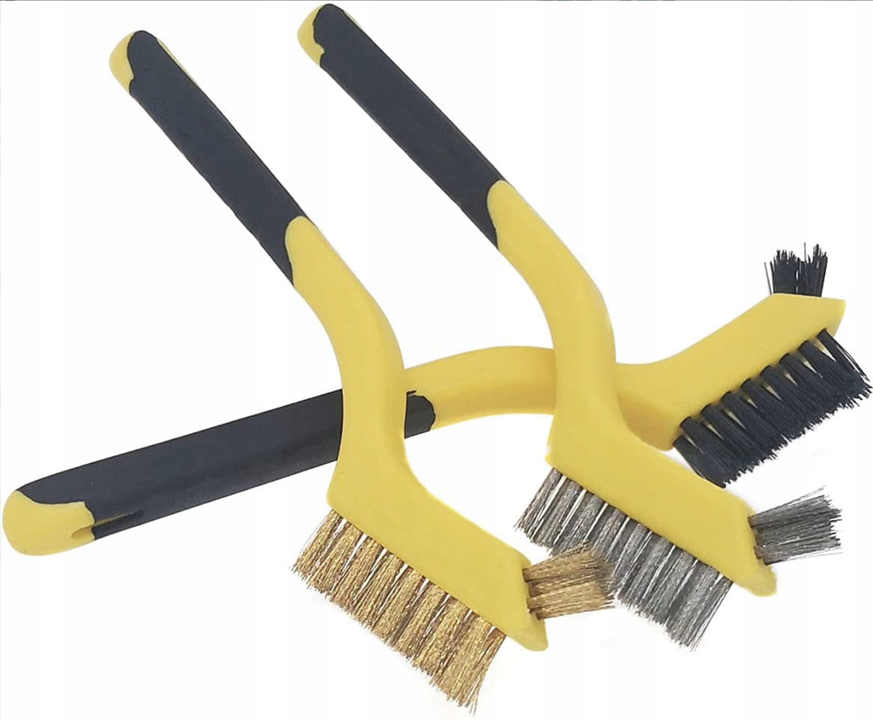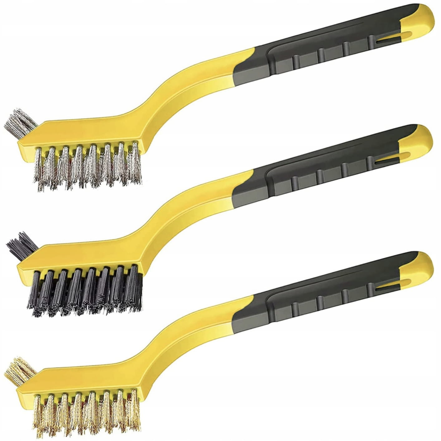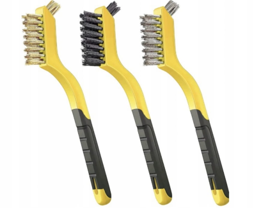 Zestaw trzech dwustronnych szczotek wykonanych z drutu stalowego, nylonowego i mosiężnego.