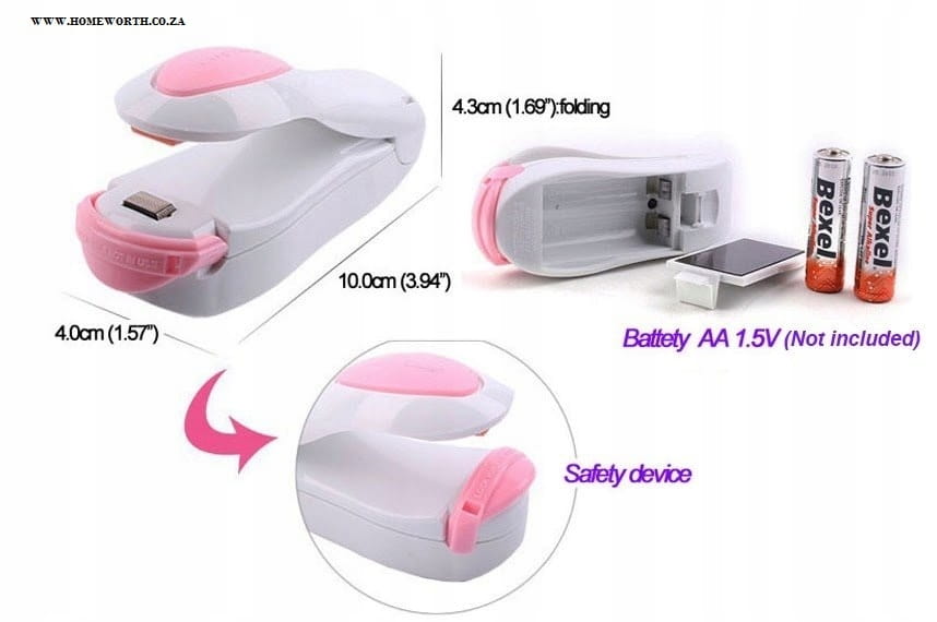Mini zgrzewarka do folii zasilana dwoma bateriami typu AA R6 (brak w zestawie).