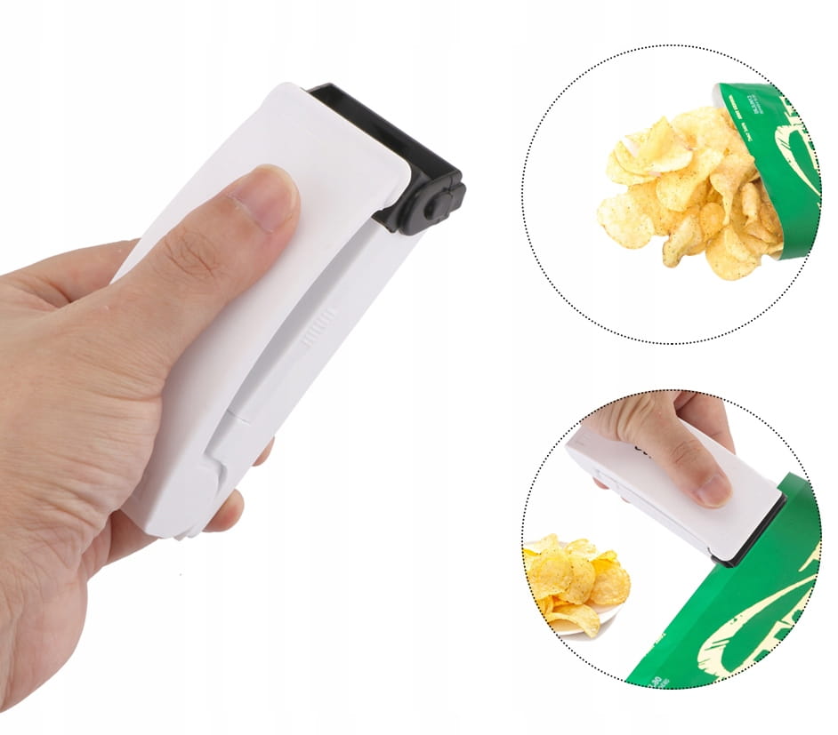 Zgrzewarka pozwoli na szybkie zamknięcie foliowych opakowań, aby produkty dłużej zachowały świeżość. Doskonale nadaje się do ponownego foliowania opakowań chipsów, makaronów itp.